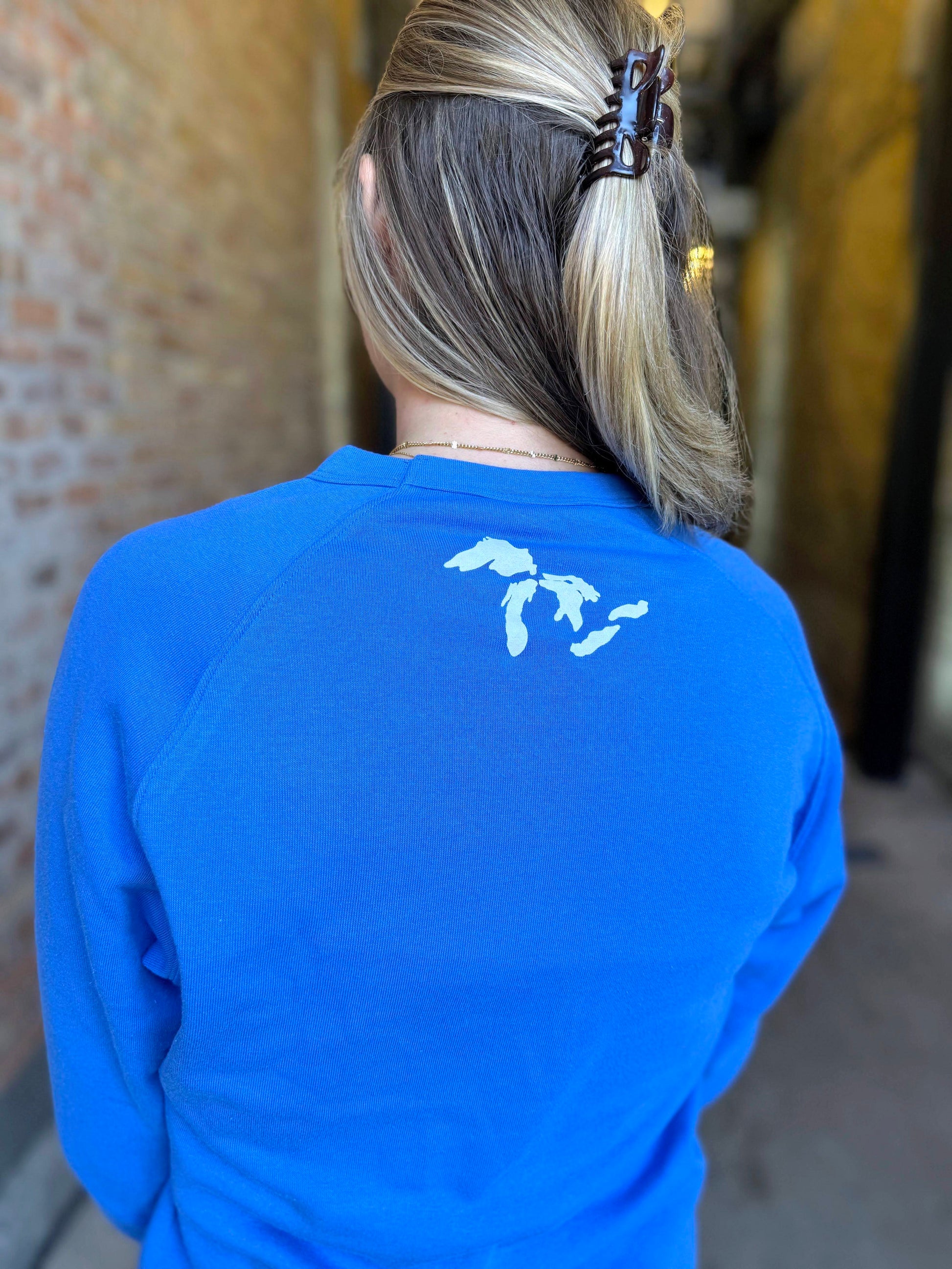 Blue sweatshirt, white lettering.