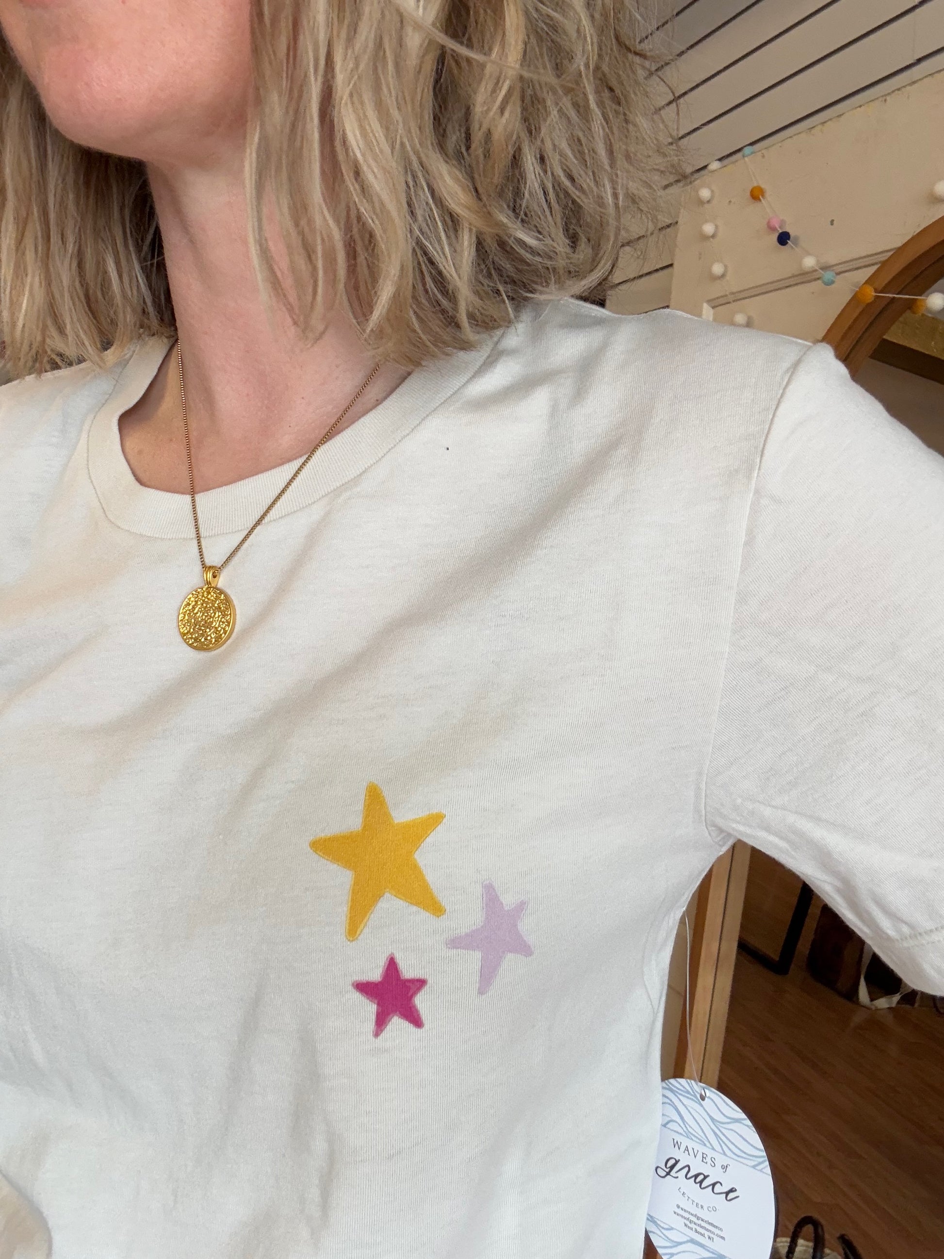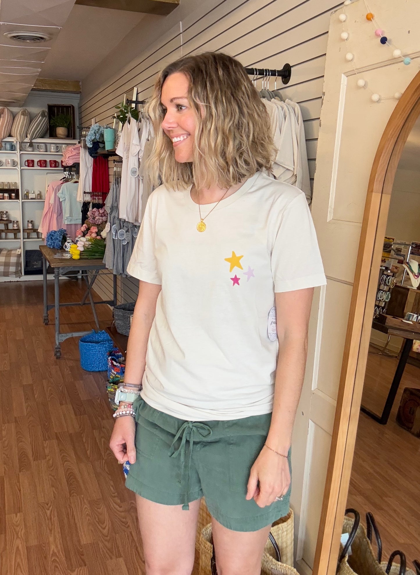 "Strong, Beautiful, Loved, Enough" hand-lettered on a neutral beige cotton blend t-shirt, playful stars on the front, and the back lettering in a rainbow of colors.